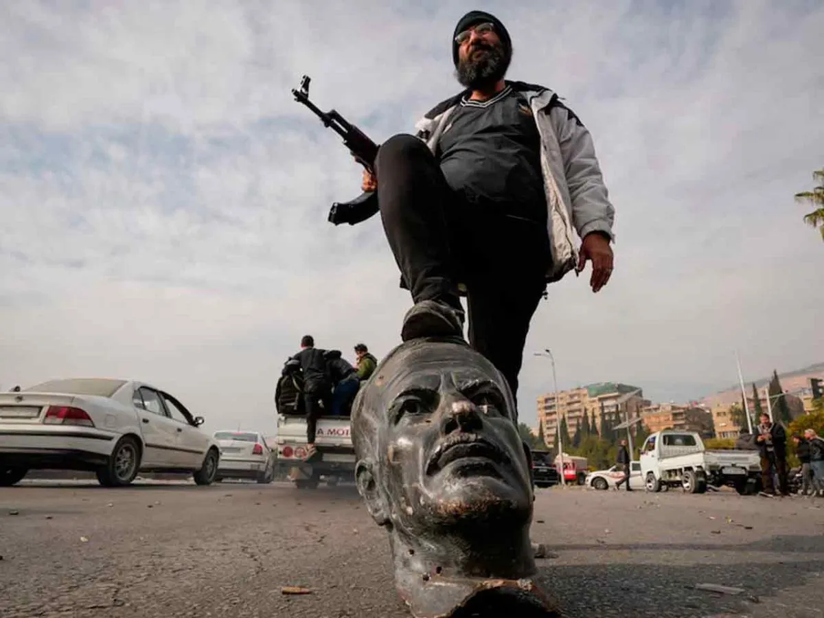 Un rebelde sirio sobre un busto del fallecido presidente sirio Hafez al-Assad en Damasco el 8 de diciembre del 2024.