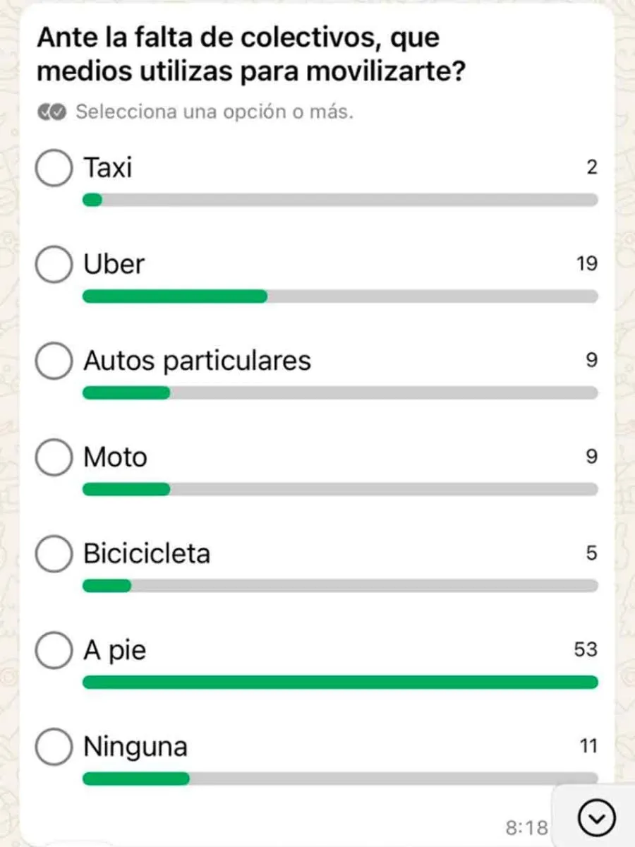 Entre todos los que enviaron sus mensajes, 53 personas expusieron que se movilizaron a pie, en tanto otras 44 personas lo hicieron por diversos medios de transporte, como autos 9 personas, Uber 19 personas, motos 9 personas, bicicletas 5 personas. Un llamado de atención para los señores concedentes, los políticos, por el impacto que en sus gestiones tiene el proceder de estos empresarios a los que confían los dineros de la gente para que inopinadamente, de manera sorpresiva sin justificación alguna dejen a pie a los usuarios del transporte público, además de provocar molestias y gastos inesperados a aquellos que tuvieron que recurrir a transportes que no tenían en sus presupuestos.