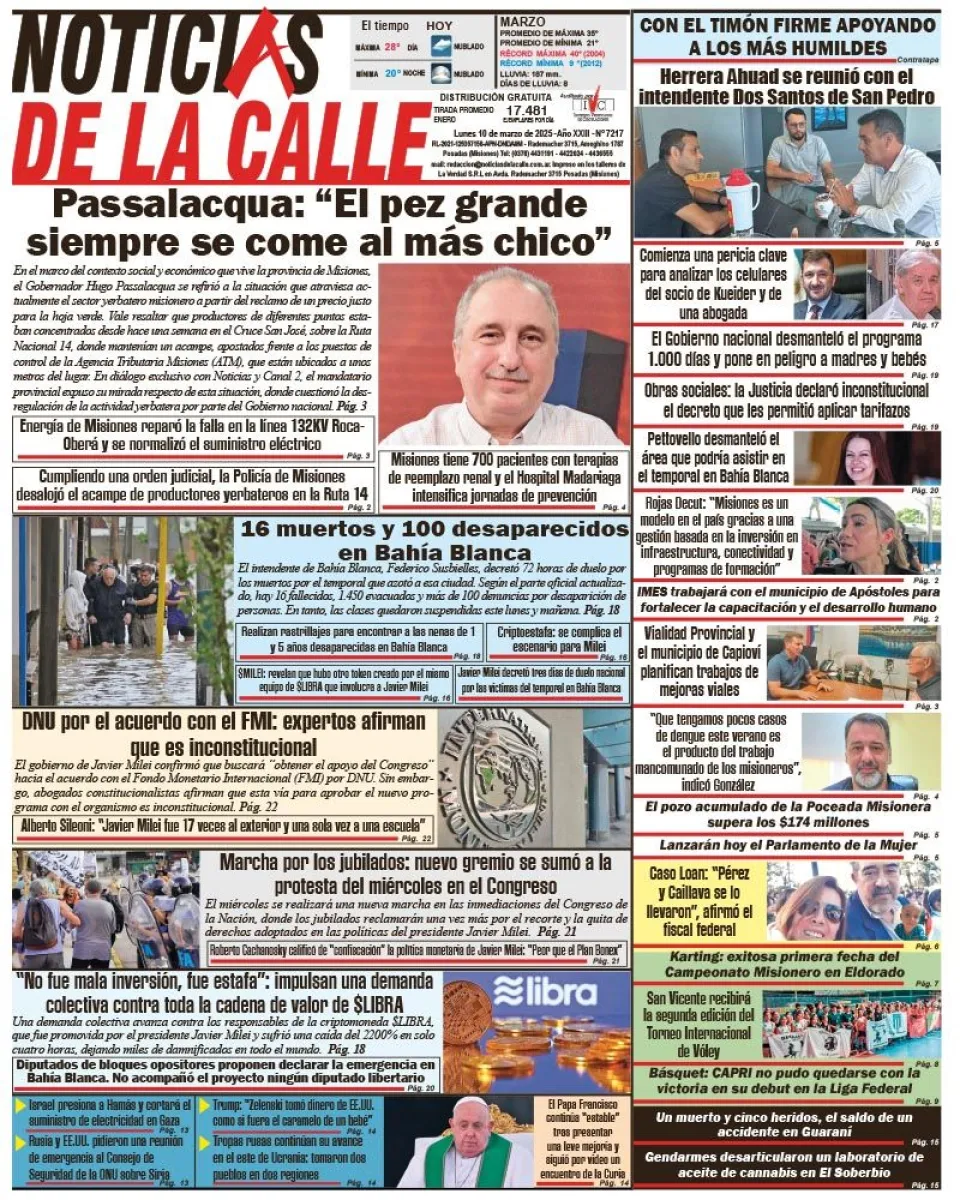 La célebre frase que desde Misiones se lanzó, “Gobernabilidad con Gobernabillidad se paga”, en ese momento por parte del Gobernador Hugo Passalacqua, tuvo por respuesta del dúo Javier Gerardo Milei y Luís “Toto” Caputo no solo quedarse con nuestra coparticipación federal, en la cual por cada 3 pesos que se llevan de Misiones nos reintegran solo uno, sino que se dispusieron a liquidar, literalmente, la economía de la yerba mate tal cual venía funcionando equitativamente en la cadena productiva para fundir al sector más débil, el de los pequeños productores y tareferos, para privilegiar al sector más poderoso, la molinería que tiene presencia en Rosario, Corrientes y la Provincia de Buenos Aires.