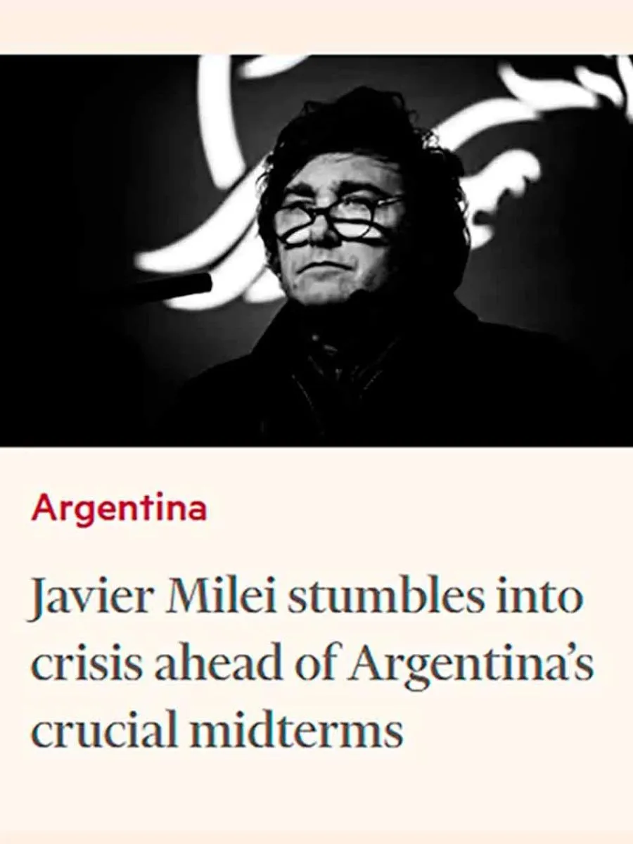 El presidente Javier Milei enfrenta la mayor crisis de su mandato, según un artículo del Financial Times. El diario británico destacó la derrota de La Libertad Avanza frente al peronismo en la provincia de Buenos Aires y advirtió sobre las consecuencias políticas y económicas de ese resultado. El texto remarca que la caída del peso y de los bonos argentinos tras la elección generó preocupación en los mercados y en la población. Milei reaccionó con la cancelación de un viaje a España, el ascenso de Lisandro Catalán como ministro del Interior y la reapertura de negociaciones con gobernadores opositores. Además, el artículo recuerda que el FMI emitió un comunicado de apoyo al Gobierno.