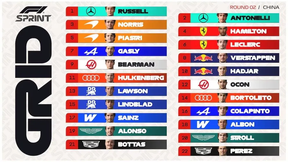 La pole position para la Sprint fue para el británico George Russell, quien confirmó el gran momento de Mercedes tras su reciente triunfo en Australia. El piloto registró un tiempo de 1m31s520, superando por 0s289 a su compañero, el joven Kimi Antonelli.